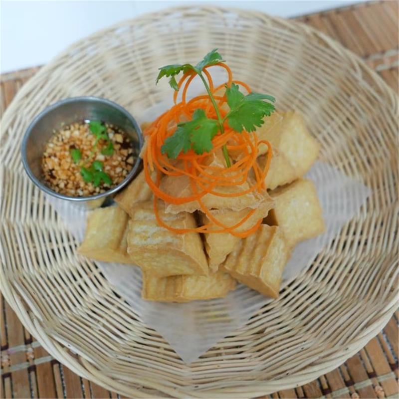 | ($19.00/person, minimum of 3) Organic silken tofu, red onions, mint, cilantro, lime, and roasted rice powder with spicy house dressing served with organic mixed fresh green, carrot, and cucumber | ||