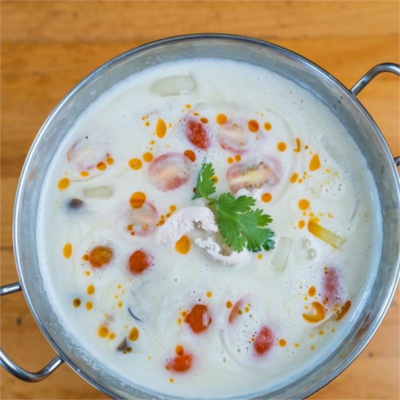 | ($16.00/person, minimum of 3) Authentic Thai coconut milk soup, chicken, onions, mushrooms, cilantro and cherry tomatoes | ||