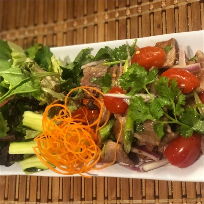 | ($20.00/person, minimum of 3) Grilled beef, red onions, green onion, mint, cilantro, cherry tomatoes with house lime dressing served with organic mix fresh green, carrot and cucumber | ||