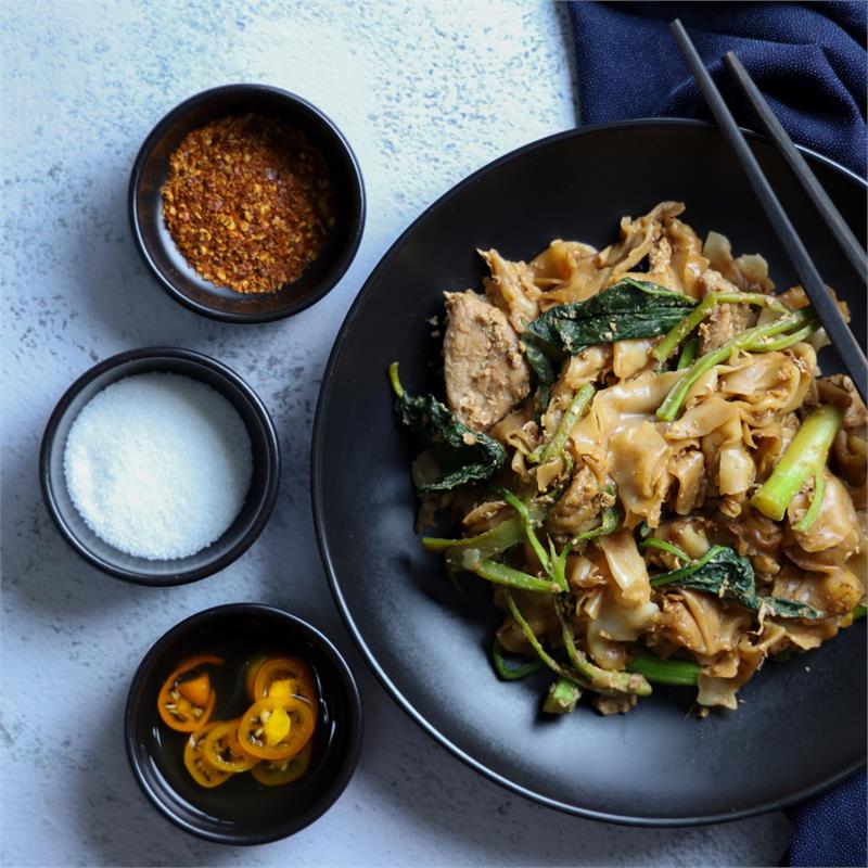 | Stir-fried flat rice noodles with chicken, egg, bean sprout, green onion, and crushed peanut | ||