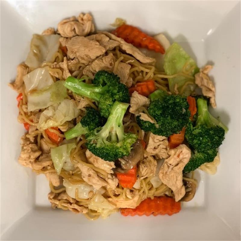 | Stir-fried mung bean noodles, tomatoes, mushrooms, carrots, onions, celery, and scallions. | ||