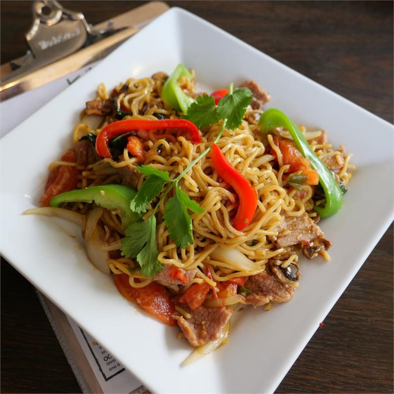 | Stir-fried wheat noodles, tomatoes, mushrooms, onions, belle peppers, sweet basil | ||