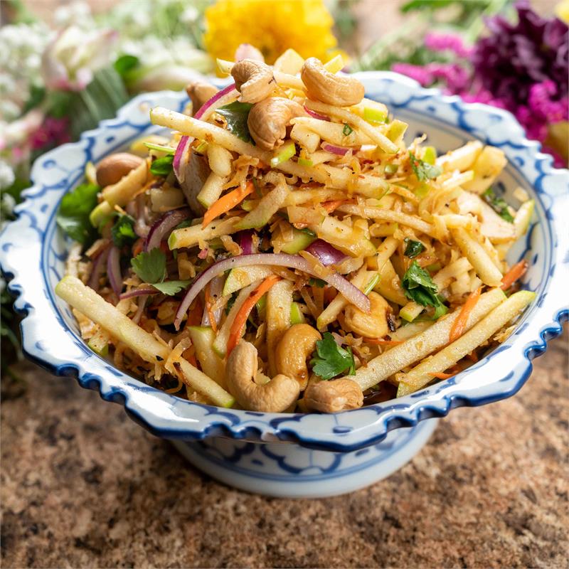 | Lemongrass, tofu, garlic, onions, basil leaves, cashews, apples, carrots and coconut mixed with hot peppers and lime juice | ||