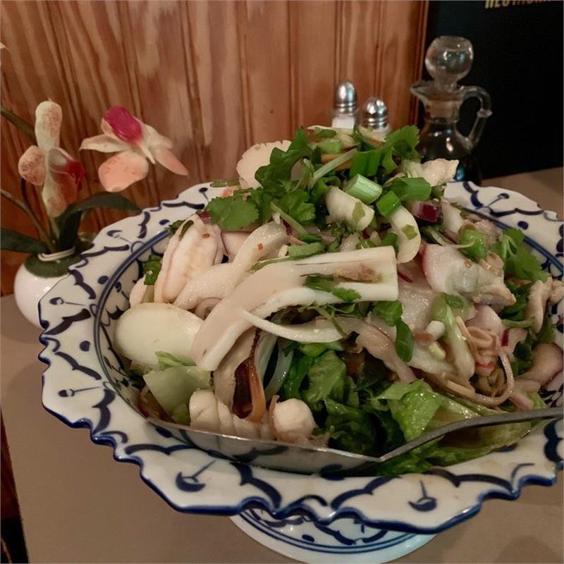 | Lightly battered fried squid served with Thai sweet chili sauce. | ||