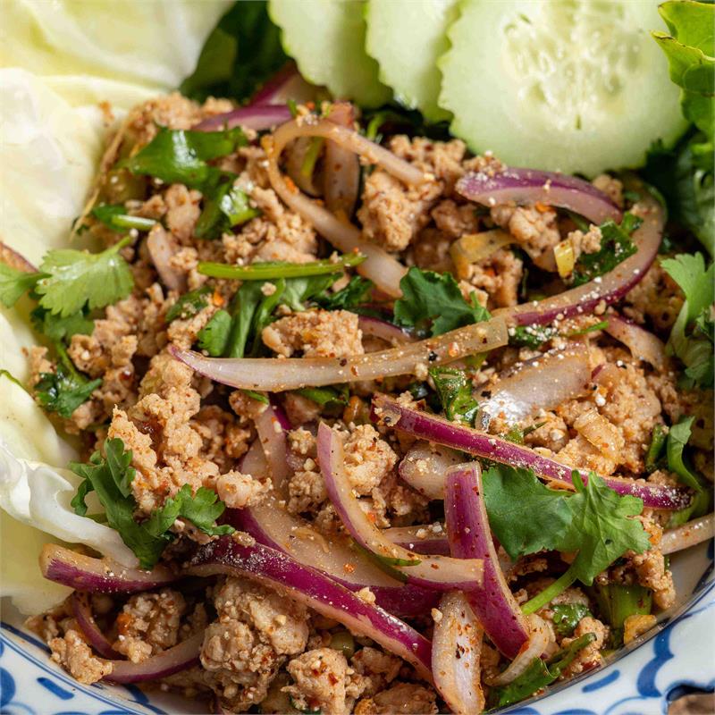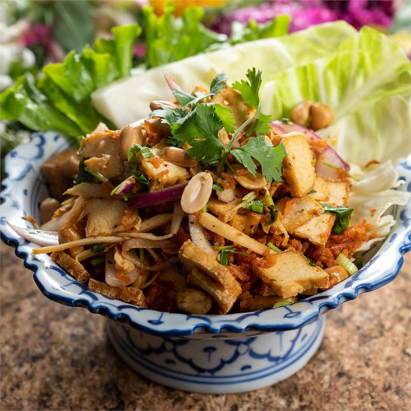 | Tofu mixed with hot peppers, lime juice, onions, rice powder, lettuce. | ||