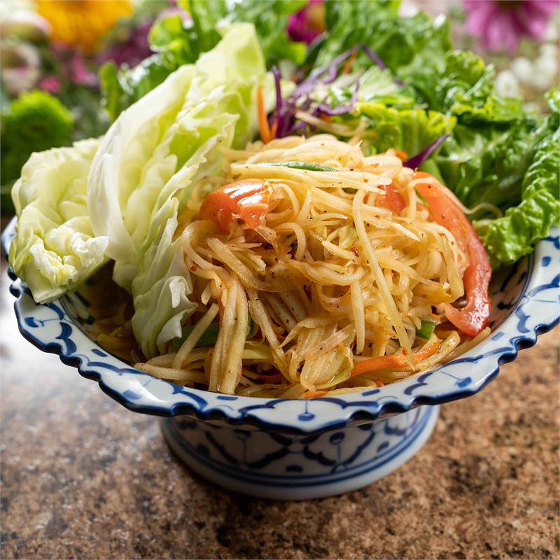 | Bean thread noodles mixed with hot and sour sauce, onions and tomatoes served on a bed of lettuce. | ||