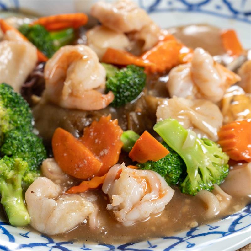 | Vegetarian. Pan-fried flat rice noodles topped with broccoli in soy bean gravy. | ||
