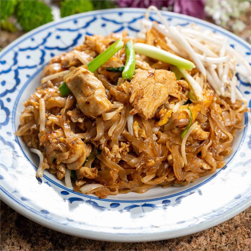 | Thin rice noodles stir-fried with egg, green onions, and bean sprouts and topped with ground peanuts. | ||