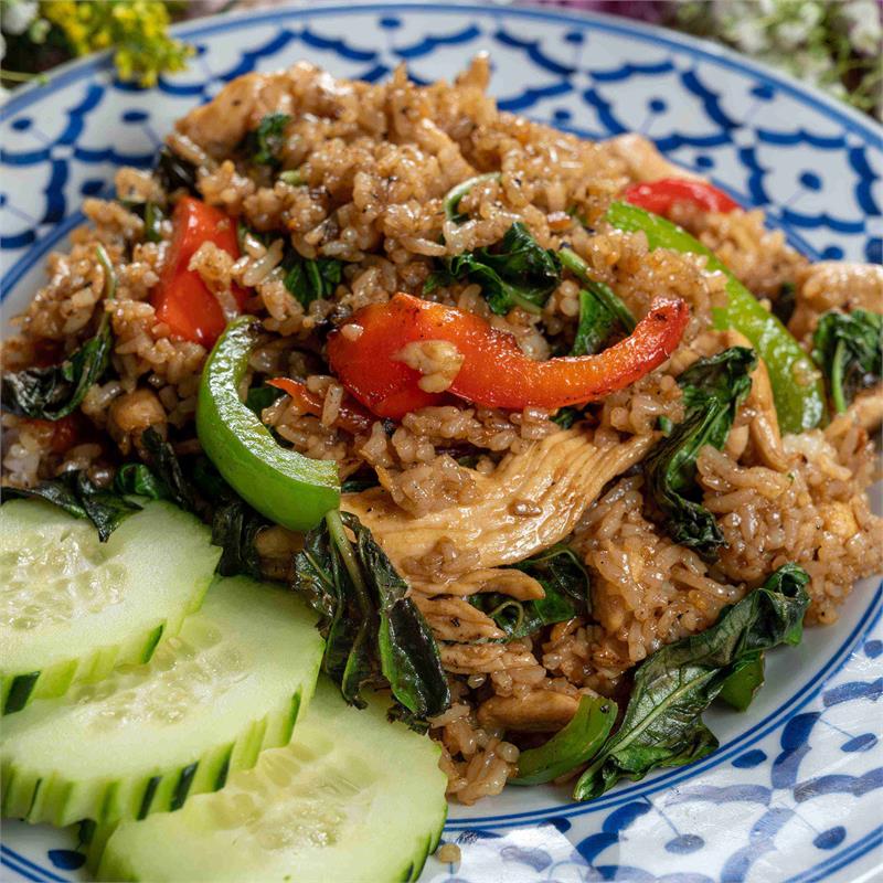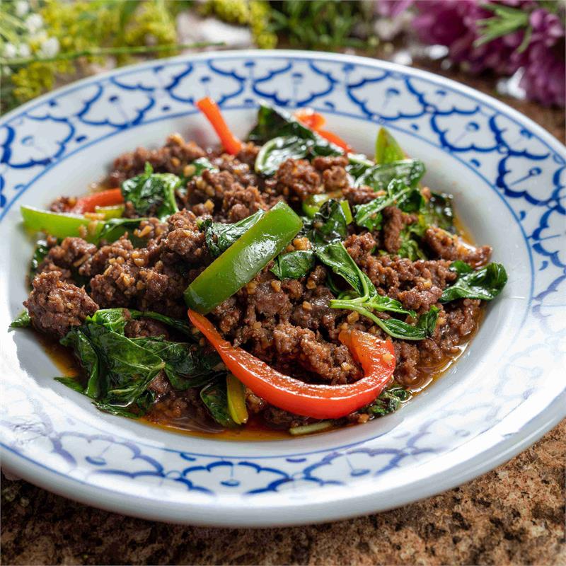 | Flat rice noodle stir fried with garlic, bell pepper, basil leaves and young green peppercorns. | ||