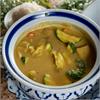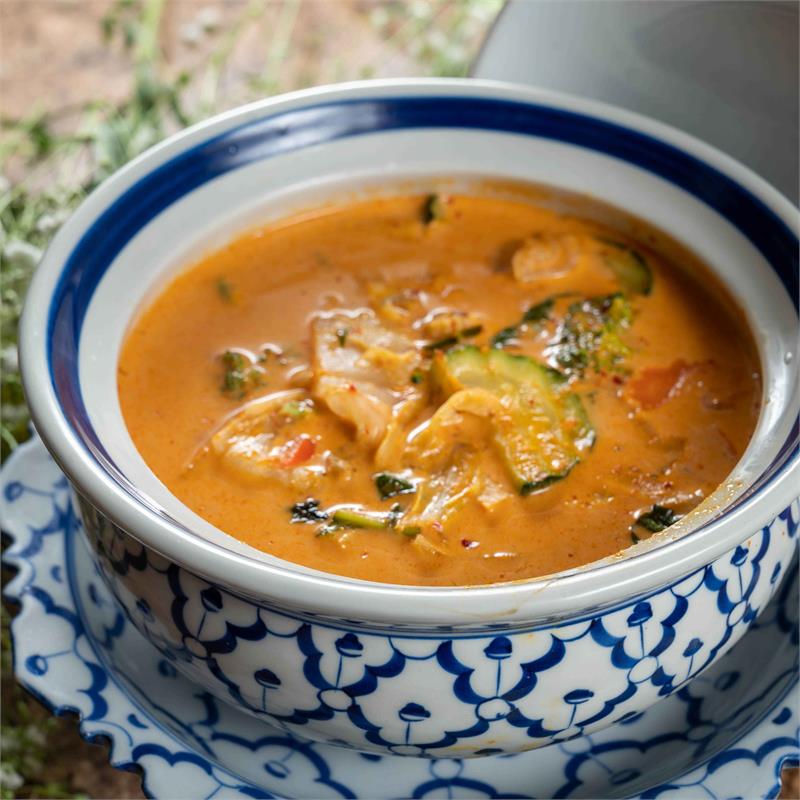 | Coconut milk with thai red curry, bamboo shoots, bell pepper. Basil and zucchini. | ||