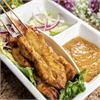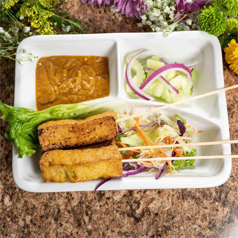 | Skewers of tofu, marinated in light curry served with peanut sauce and cucumber salad. | ||
