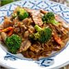 | Vegetarian. Stir-fried flat rice noodles with broccoli and soy bean sauce. | ||