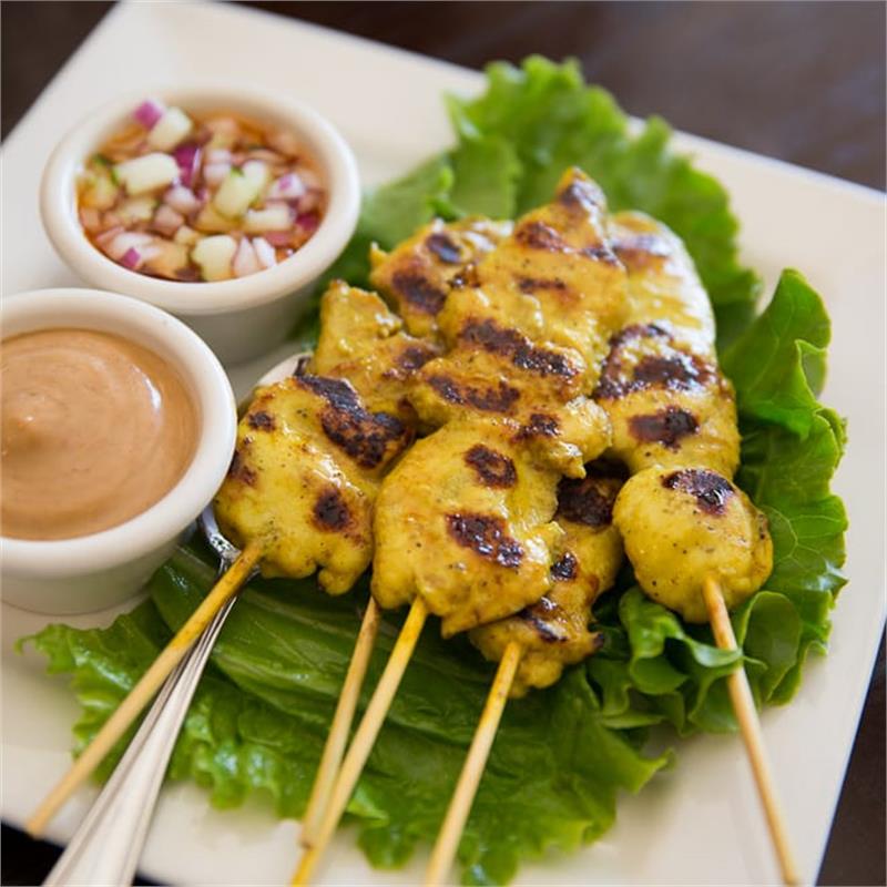 | (5 skewers) Grilled chicken skewers marianted in flavored coconut milk & curry powder, served with cucumber chutney and peanut sauce. | ||