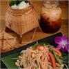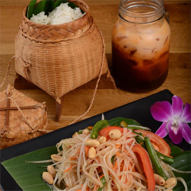 | An iconic Thai street food dish, Shredded green papaya, garlic, lime juice, fresh Thai chili, tamarind sauce, tomato, green been topped with ground peanut.(Add 3 Shrimps for $3 | ||