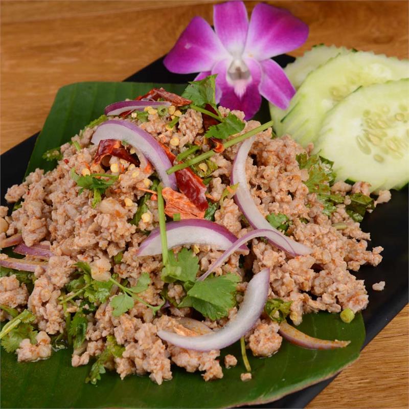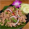 | A flavorful salad of ground meat from northeastern Thailand loaded with fresh herbs, red onion, green onion, cilantro, mint, lime juice, and touch of toasted rice powder | ||