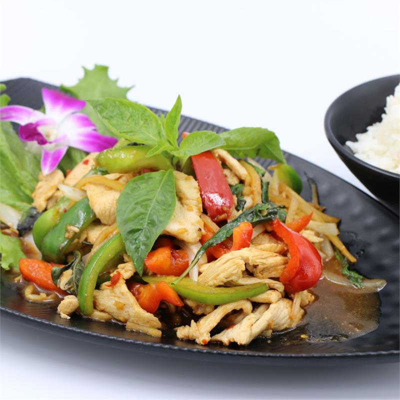| A very popular dish among Thai. A combination of fresh Thai chili, basil, garlic, onions, bamboo shoots, green and red bell peppers. | ||