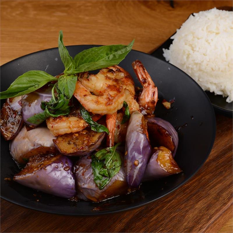 | Eggplant, garlic, basil, fresh Thai chili, red and green bell peppers. | ||