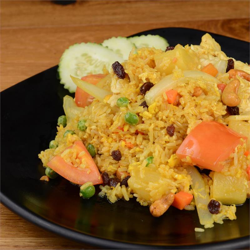 | Unique fried rice with pineapple, egg, tomato, white onions, cashew nuts, raisin, and curry powder. | ||