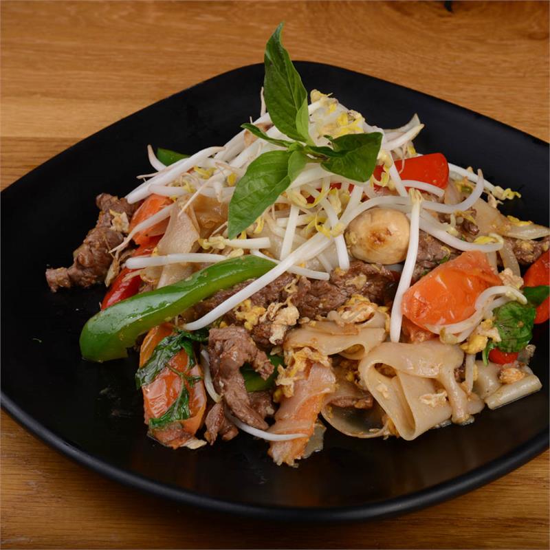 | A popular stir-fry noodles dish, wok fried flat rice noodles aromatics with basil and garlic, egg, tomatoes, onions, bean sprouts, mushroom, red and green pepper, spiced it up with fresh Thai chili. | ||