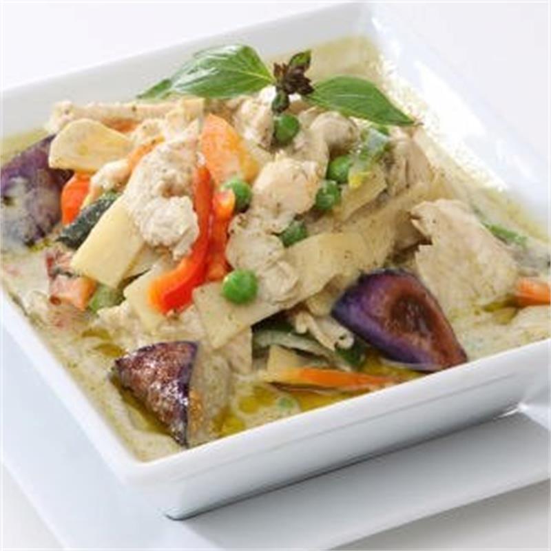 | With green curry paste, coconut milk, eggplant, bamboo shoots, bell pepper and sweet basil | ||