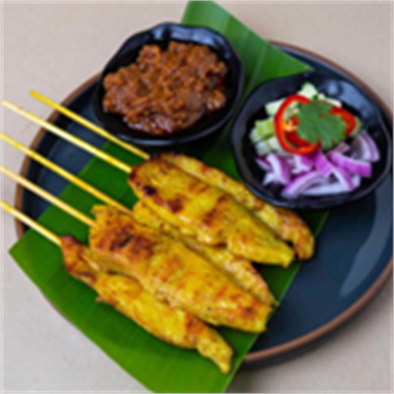 | Grilled marinated chicken on skewers, served with peanut sauce and cucumber salad | ||