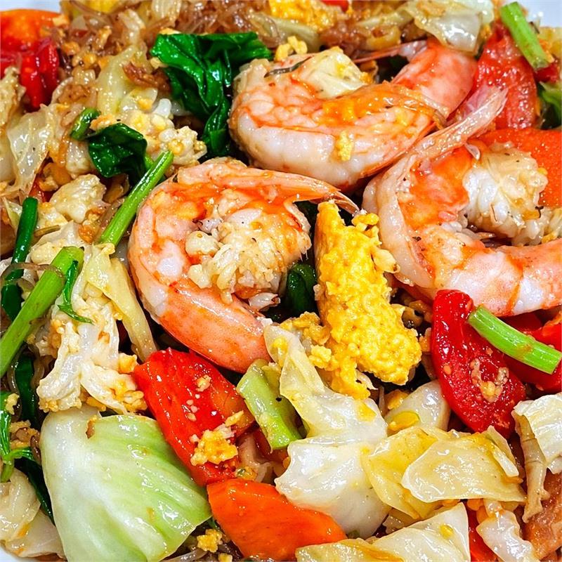 | Stir-fried premium silver noodles (100% bean thread), egg, cabbage, white and green onions, celery, tomatoes, and black mushroom. Your choice of vegetables at no additional charge. | ||