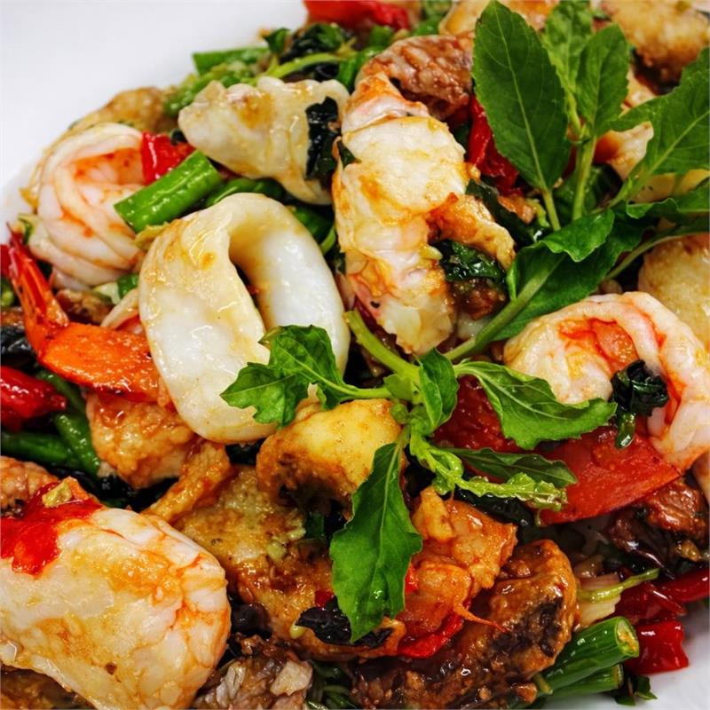 | Classic Thai basil Stir-fried with green bean, bell peppers, and Thai chilies. It is the number one street food in Thailand. | ||