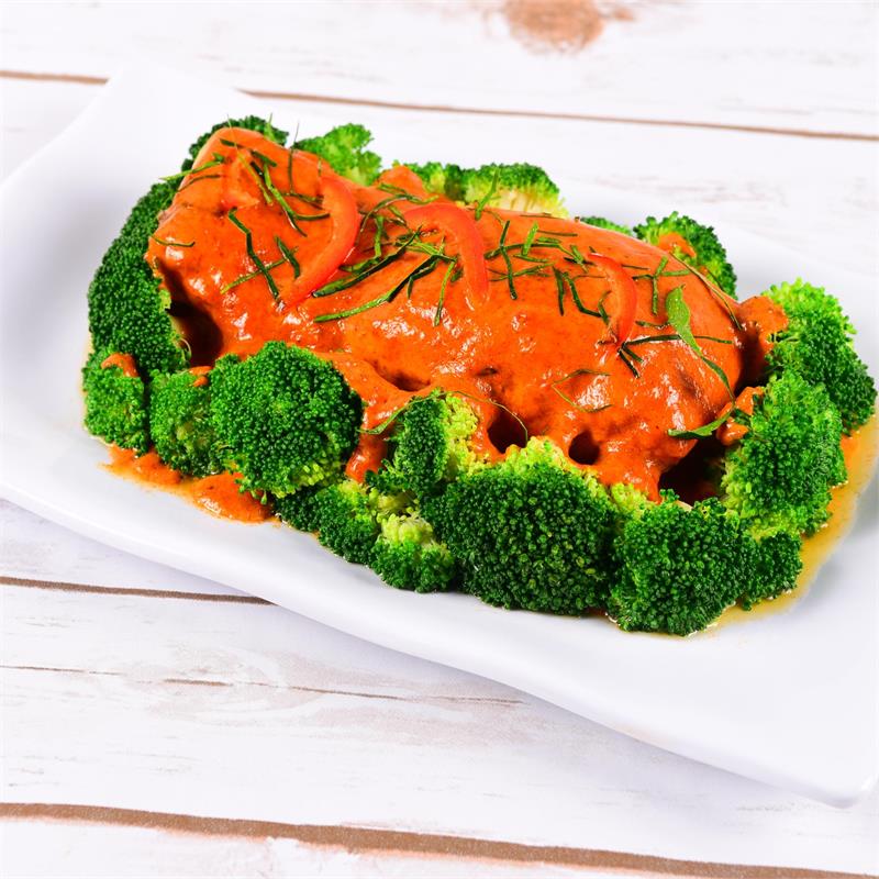 | Grilled salmon with Panang curry sauce in coconut milk. Served with steamed broccoli. | ||