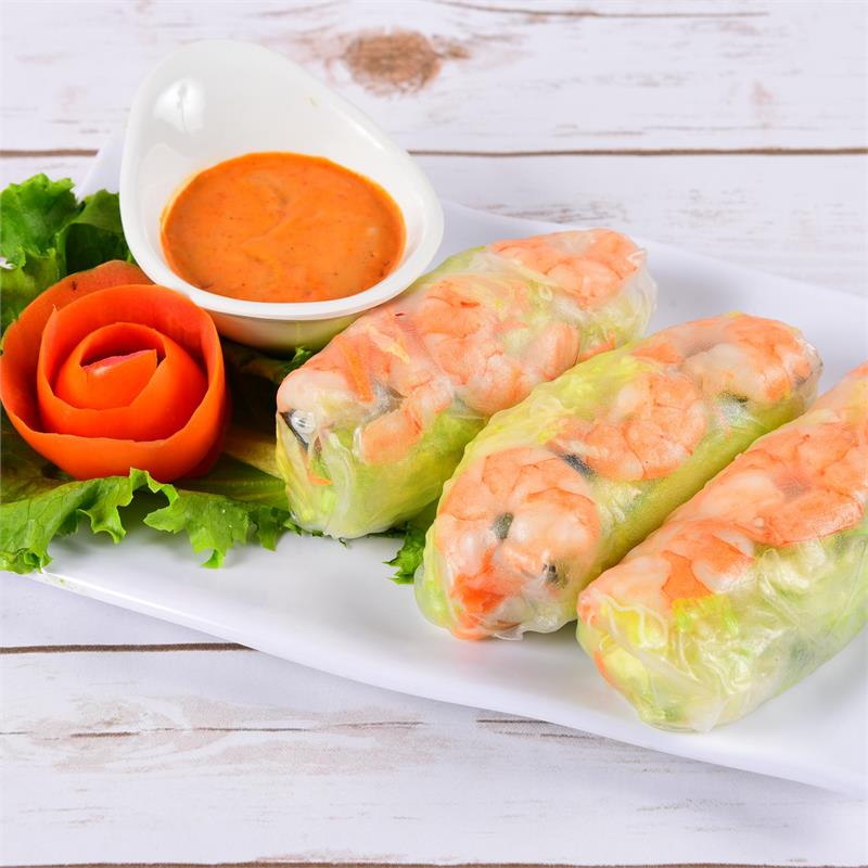 | Peanut Alert! Crispy and fresh salad vegetable and shrimp wrapped in thin rice paper. Served with peanut dipping sauce. | ||