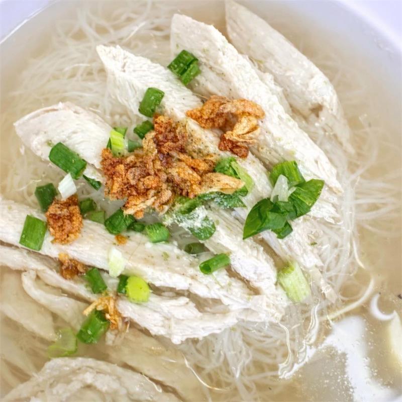 | Rice noodles with sliced chicken, garlic, and shallots in a special house broth. No meat substitution. | ||