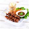 | Herbal marinated pork on skewers. Grilled to perfection. Served with a side of plain sticky rice and homemade spicy sauce. | ||