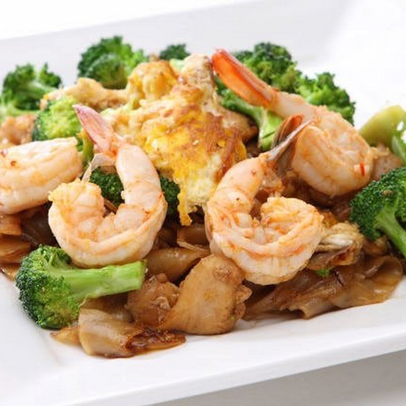 Pan fried big flat rice noodles with egg, broccoli in brown sauce.