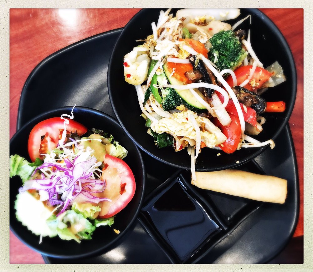 A popular stir-fry noodles dish, wok fried flat rice noodles aromatics with basil and garlic, egg, tomatoes, onions, bean sprouts, mushroom, red and green pepper, spiced it up with fresh Thai chili.