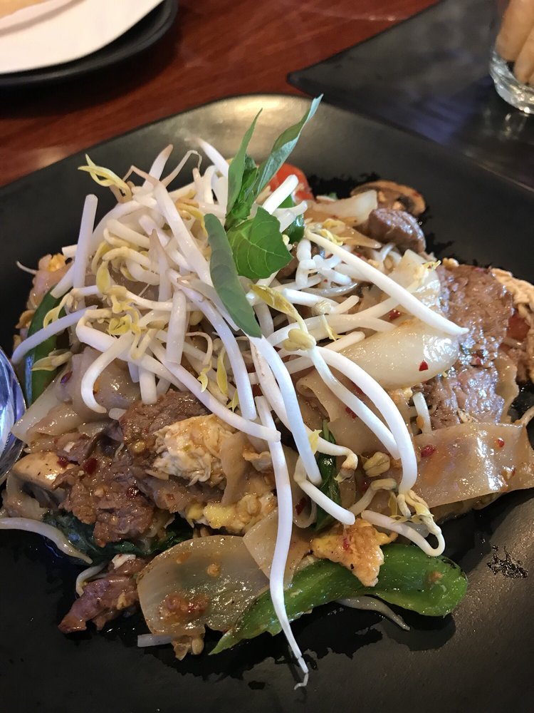 A popular stir-fry noodles dish, wok fried flat rice noodles aromatics with basil and garlic, egg, tomatoes, onions, bean sprouts, mushroom, red and green pepper, spiced it up with fresh Thai chili.
