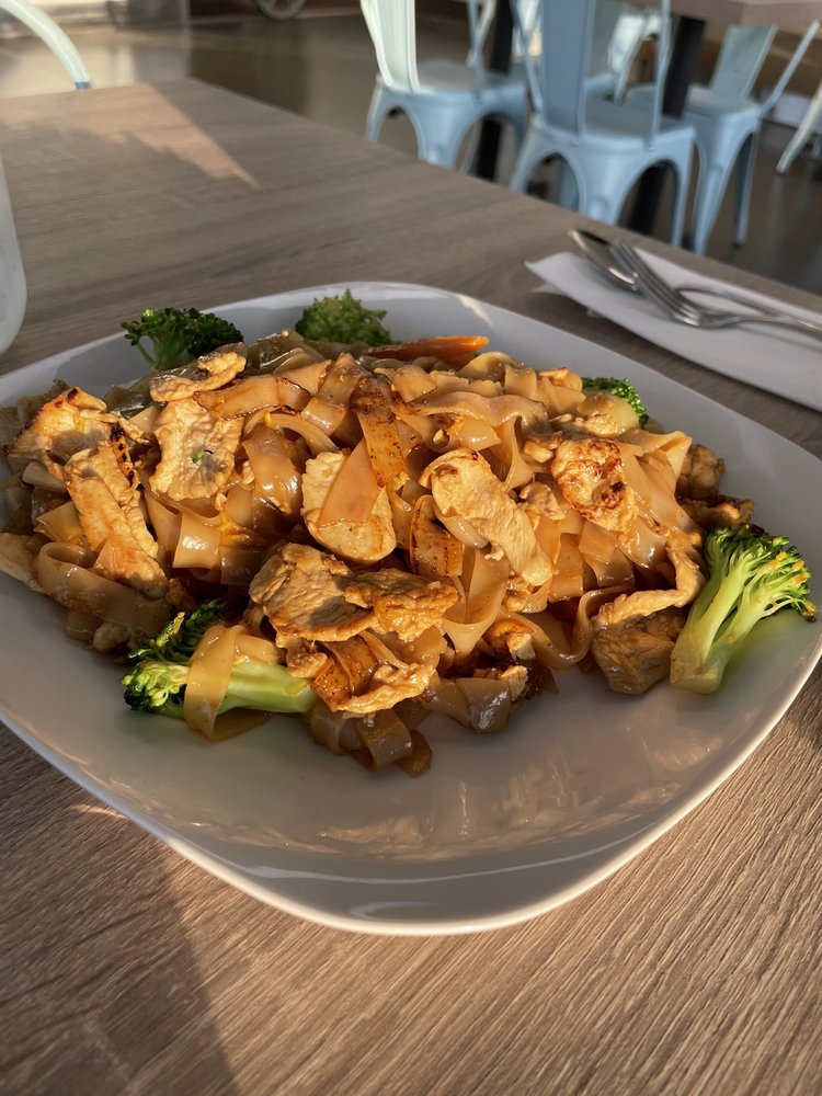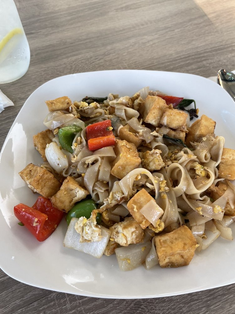 Stir-fried flat rice noodles, egg, onion, bell pepper, basil, and chili.