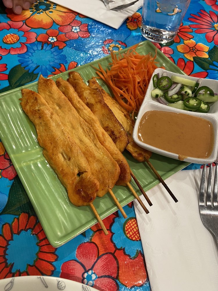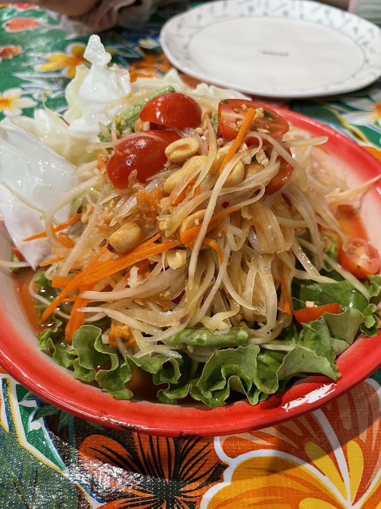 Thin rice noodles with egg, green onion, bean sprouts, and ground peanuts.