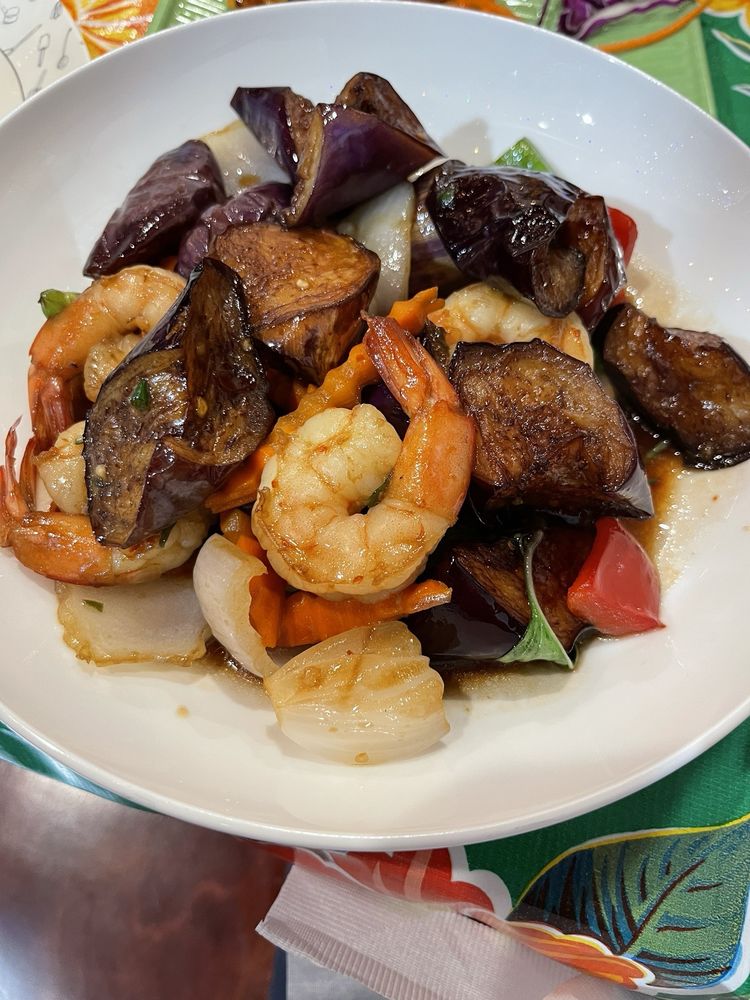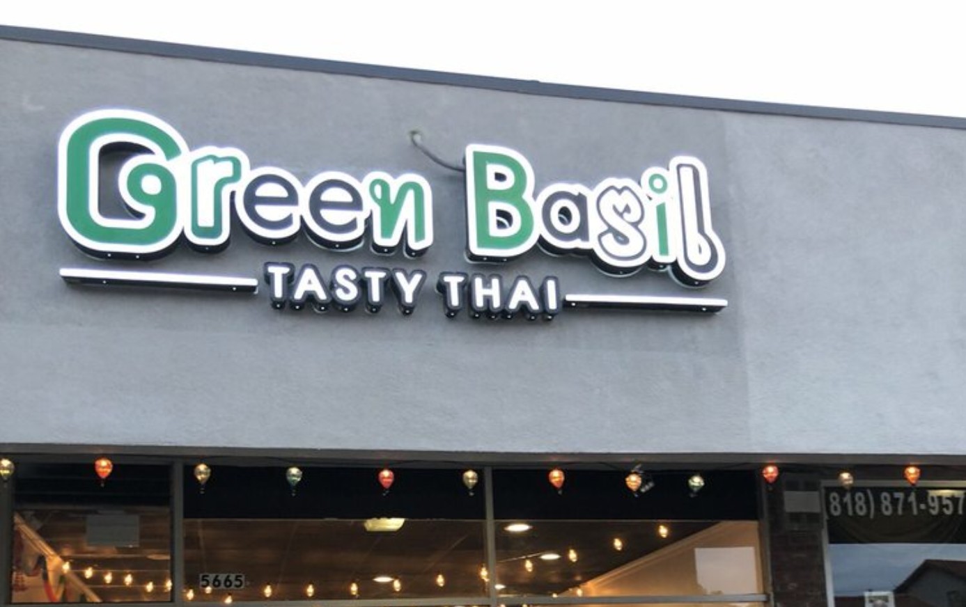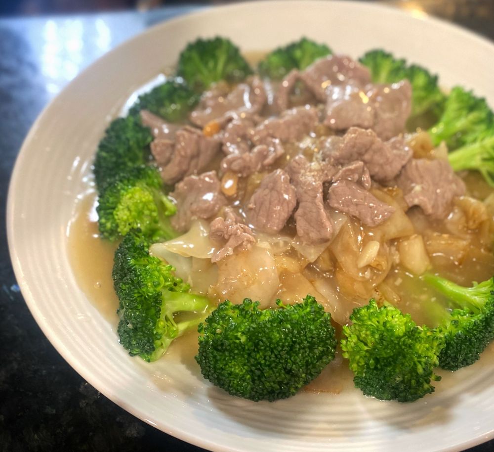 Flat rice noodles with spicy Thai chili, bell peppers, white onion, and green basil.