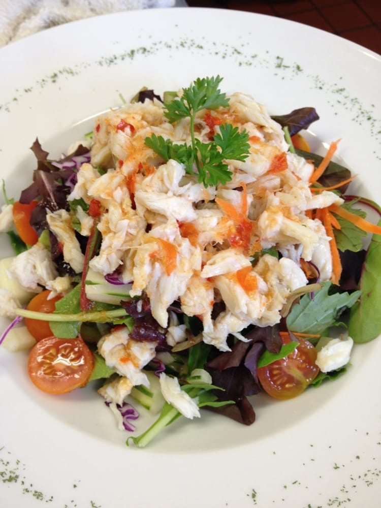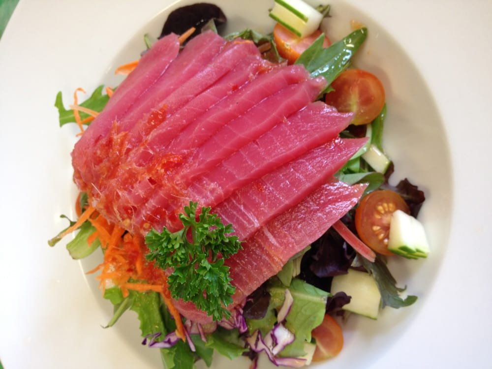 Cube-cut filet mignon and shrimp with garlic sauce atop yellow spicy fried rice.
